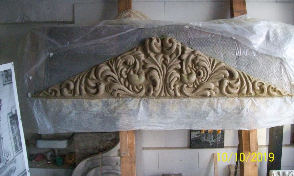 Nach Recherchen und zeichnerischen Vorarbeiten hat Bildhauer Christoph Reichenbach akribisch das florale Relief im Dreieckgiebel des Barockflügel-Portals zuerst aus Ton in Originalgröße nachgebildet (Foto).