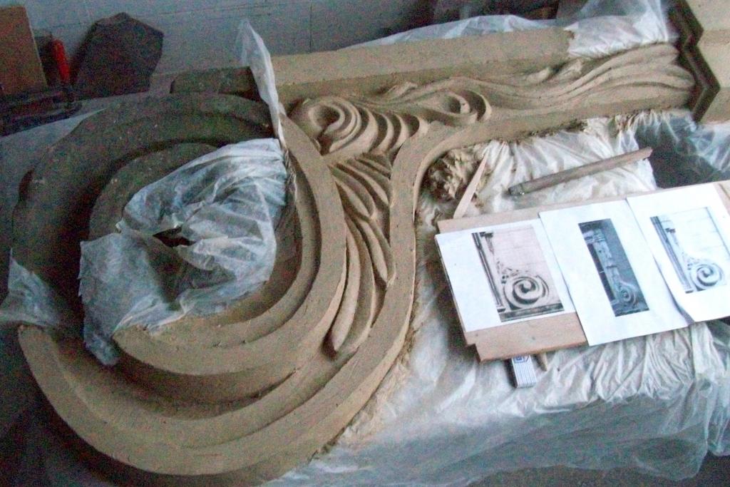 Als Vorarbeit zur Nachbildung der rechten Votute des Barockflügel-Portals hat der hallesche Bildhauer und Restaurator Christoph Reichenbach ein Tonmodell dieses schneckenförmigen Zierelements angefertigt. Vorhandenes wurde integriert. Das nebenstehende Foto zeigt den Bauschmuck im Atelier des Bildhauers.