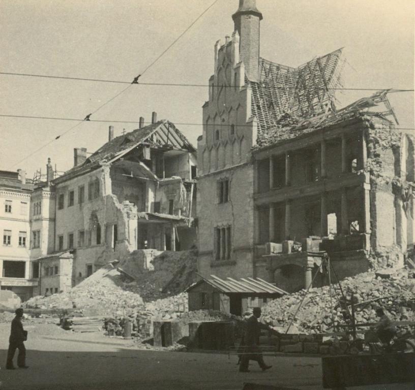 Foto (Sammlung B. Schröter): Ratswaage (links) und nördlicher Teil des Alten Rathauses (rechts) nach dem Bombenabwurf und Abbruch des Rathausturmes
