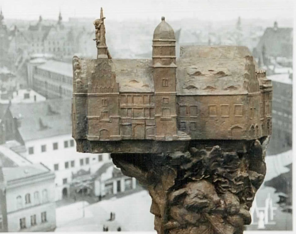 Foto (BI-Archiv): Bronzeplastik des Alten Rathauses vor einem Poster, fotografiert von Wolfgang Altrichter 2001