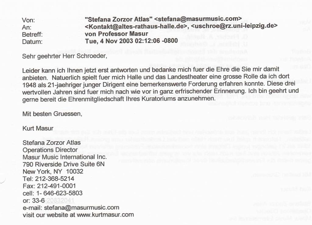 Mit Schreiben vom 4.11.2003 aus New York nahm Kurt Masur die Ehrenmitgliedschaft im Kuratorium Altes Rathaus Halle (Saale) e.V. an.