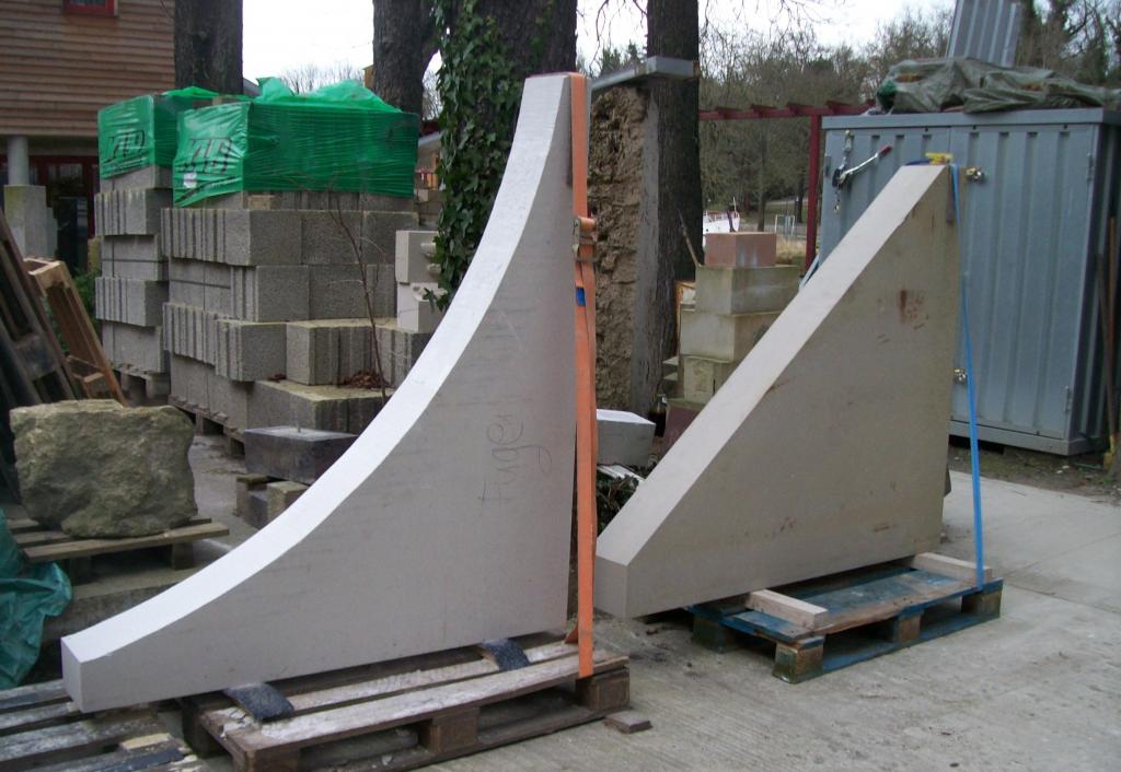Die Sandstein-Rohlinge für die beiden Bogenzwickel des Barockflügel-Portals (Steine Nr. 62 & 64) sind angekommen. Bogenzwickel sind die Flächen zwischen dem Rundbogen und ihrer rechtwinkligen Umrahmung. Die Krümmung ist beim linken schon bearbeiteten Stein bereits zu sehen. In die Flächen arbeitet Bildhauer Ch. Reichenbach die floralen Reliefs ein.