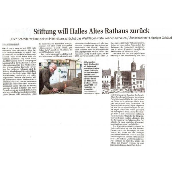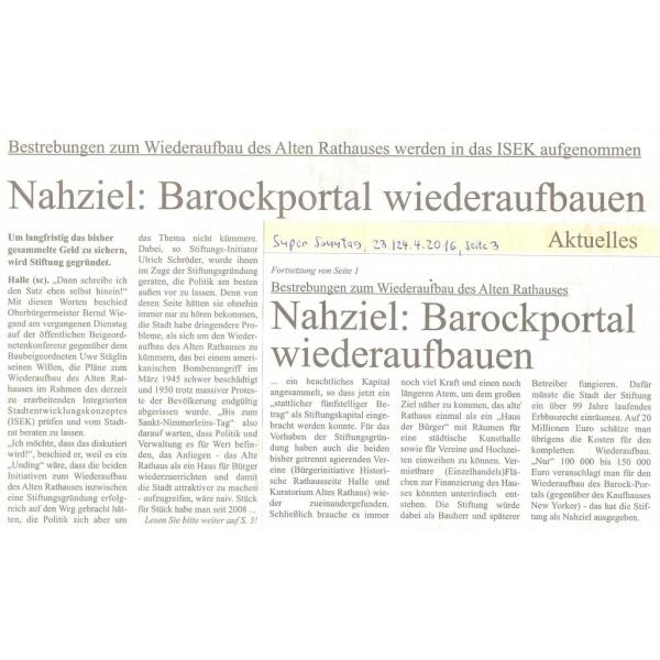 Die "Mitteldeutsche Zeitung" veröffentlichte am 13. April 2018 im "Saalekurier" einen Beitrag von Detlef Färber mit der Überschrift "Portal als realistisches Ziel" und dem Untertitel "Seit zehn Jahren setzt sich eine Bürgerinitiative für den Wiederaufbau des alten Rathauses ein - und bewegt etwas."