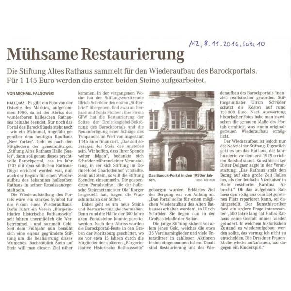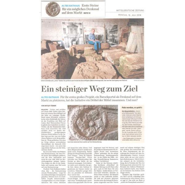 "Ein steiniger Weg zum Ziel" - unter diesem Titel veröffentlichte Detlef Färber in der "Mitteldeutschen Zeitung" vom 16. Juli 2018 (Seite 10) seinen Beitrag über die Fortschritte bei der Restaurierung und Nachbildung von Steinen des Barockflügel-Portals des Alten Rathauses. Etwa ein Drittel der ca. 90 Portalsteine haben inzwischen einen "Steinpaten" gefunden. Ab einem Nettopreis von 150 Euro kann man schon "Pate" werden.