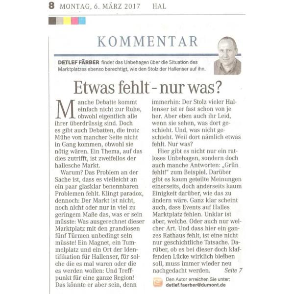 Kommentar von Detlef Färber zum halleschen Marktplatz in der Mitteldeutschen Zeitung am 6. März 2017, Seite 8. Der Kommentator bezog sich auf seinen Artikel "Drehen bis es leuchtet" auf der vorangehenden Seite. Die Online-Version des Artikels, veröffentlicht am 7. März unter dem Titel "Marktplatz Halle - Was fehlt, damit der Platz richtig brummt" ...