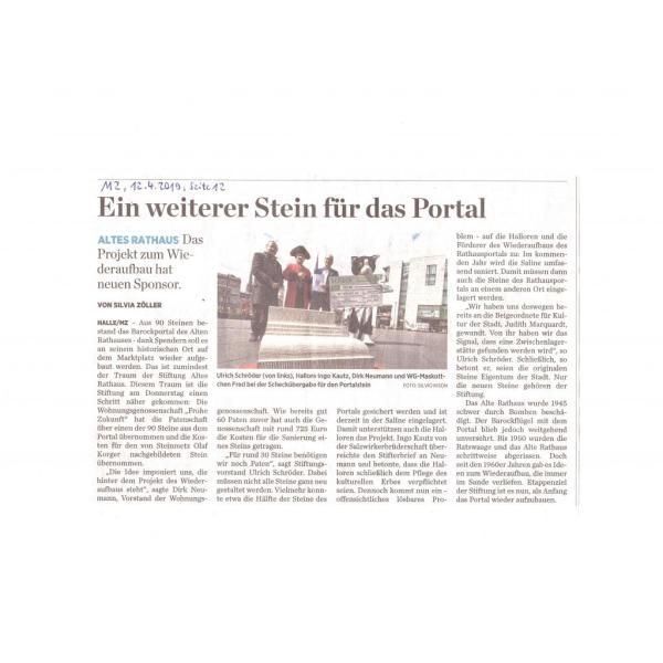 In der "Mitteldeutschen Zeitung" vom 12.4.2019 veröffentlichte Silvia Zöller den Artikel "Ein weiterer Stein für das Portal" (Seite 12). Anlass war die Übergabe des Stifterbriefes für den Portalstein Nr. 46 durch ein Mitglied der Salzwirkerbrüderschaft an den Vorstand der Halleschen Wohnungsgenossenschaft FREIHEIT eG.
