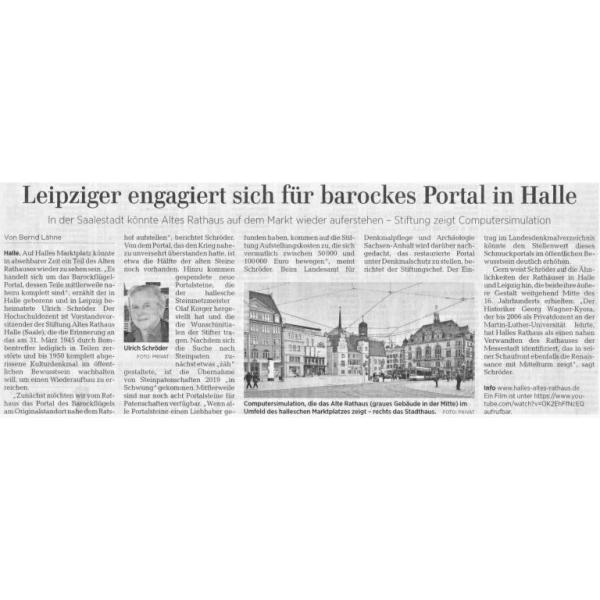 Von Bernd Lähne erschien am 16.1.2020 in der Online-Ausgabe der "Dresdner Neuesten Nachrichten" ein Beitrag über das barocke Portal des 1950 abgetragenen nahezu unzerstörten Südflügels von Halles Altem Rathaus.
