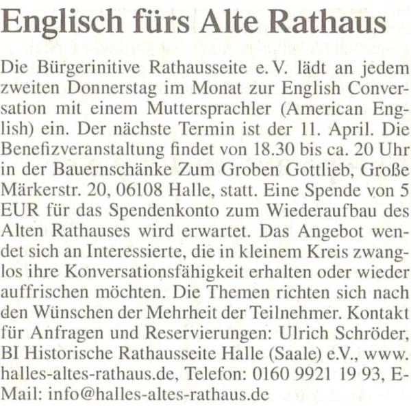 Benefizveranstaltung für Halles Altes Rathaus: Englische Konversation im kleinen Kreis mit einem Muttersprachler an jedem 2. Donnerstag im Monat - ein Angebot der BI Rathausseite e.V. gegen eine Spende von 5 Euro für jede "Sitzung" von ca. 90 Minuten Dauer. Die Gesprächsthemen werden von den Teilnehmern gewählt.